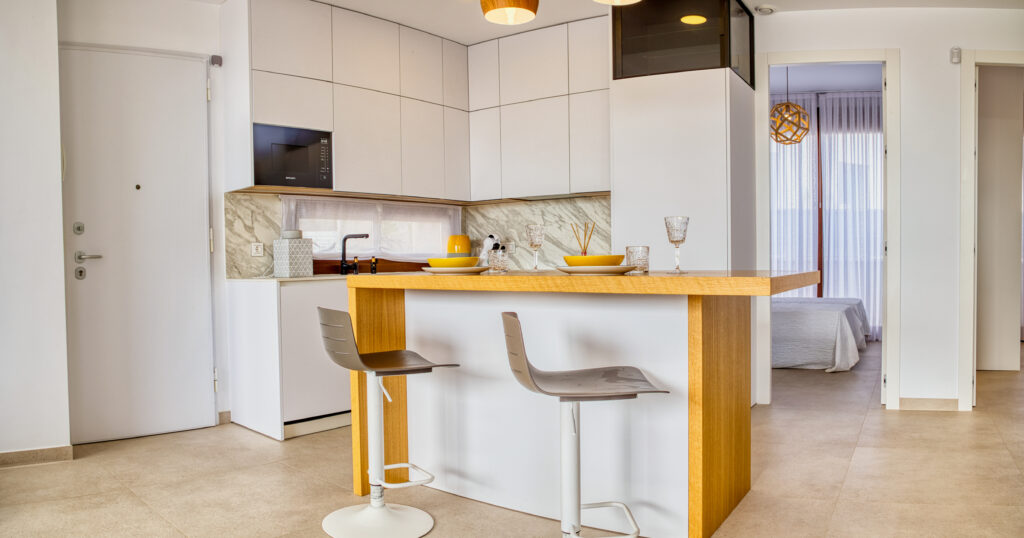 Model Estrella – wszystkie pomieszczenia znajdują się na jednej kondygnacji. Składa się z 2 sypialni, 2 łazienek, przestronnego i jasnego salonu z jadalnią oraz otwartej kuchni z centralną wyspą. Duże okna zapewniają mnóstwo naturalnego światła.